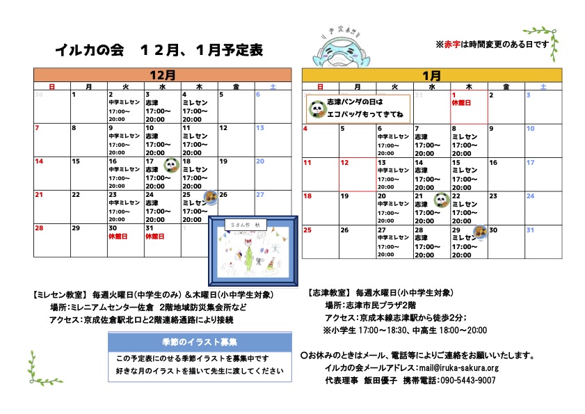 小中学校全般…12/24-1/6 冬休み 1/8-9 給食開始 2/5まで公立高校出願 2/17-18公立高校入試検査日